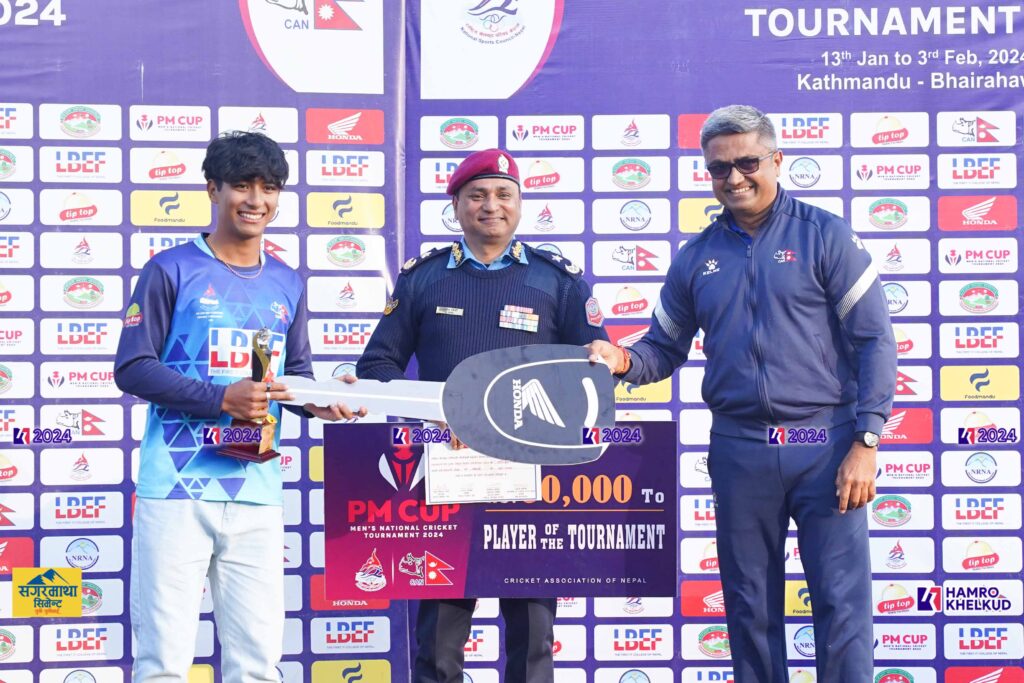 Kathmandu (Hamro Khelkud) – Bagmati Province’s young spinner Surya Tamang has been adjudged the Player of the Tournament of the PM Cup Men’s National Cricket 2080. Surya was announced as the best player following Nepal Police Club’s triumph over the Tribhuwan Army Club in the final.